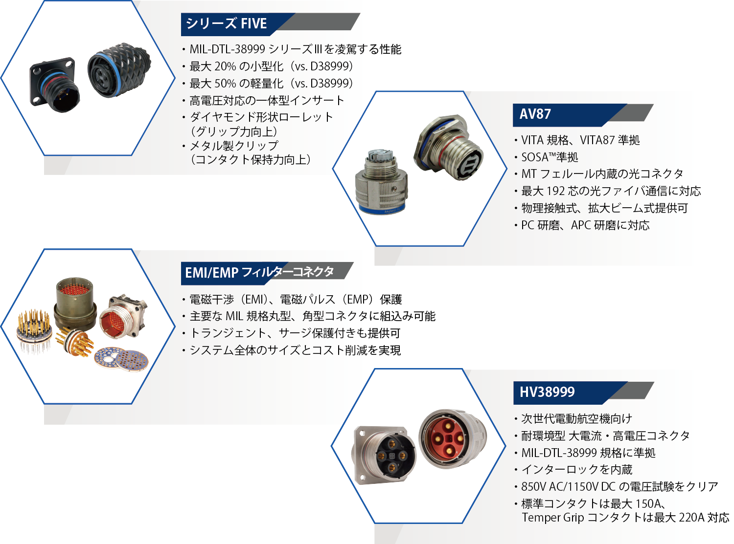 弊社ブースでは、SOSA™ 規格準拠品など、次世代の航空宇宙・防衛装備品の製品開発をサポートする最新鋭のインターコネクト技術をご紹介します。次期戦闘機、スタンドオフミサイル防衛、eVTOLの関連製品をご紹介するほか、欧米の主要な防衛プログラムで豊富な実績を誇る業界スタンダード製品を展示いたします。