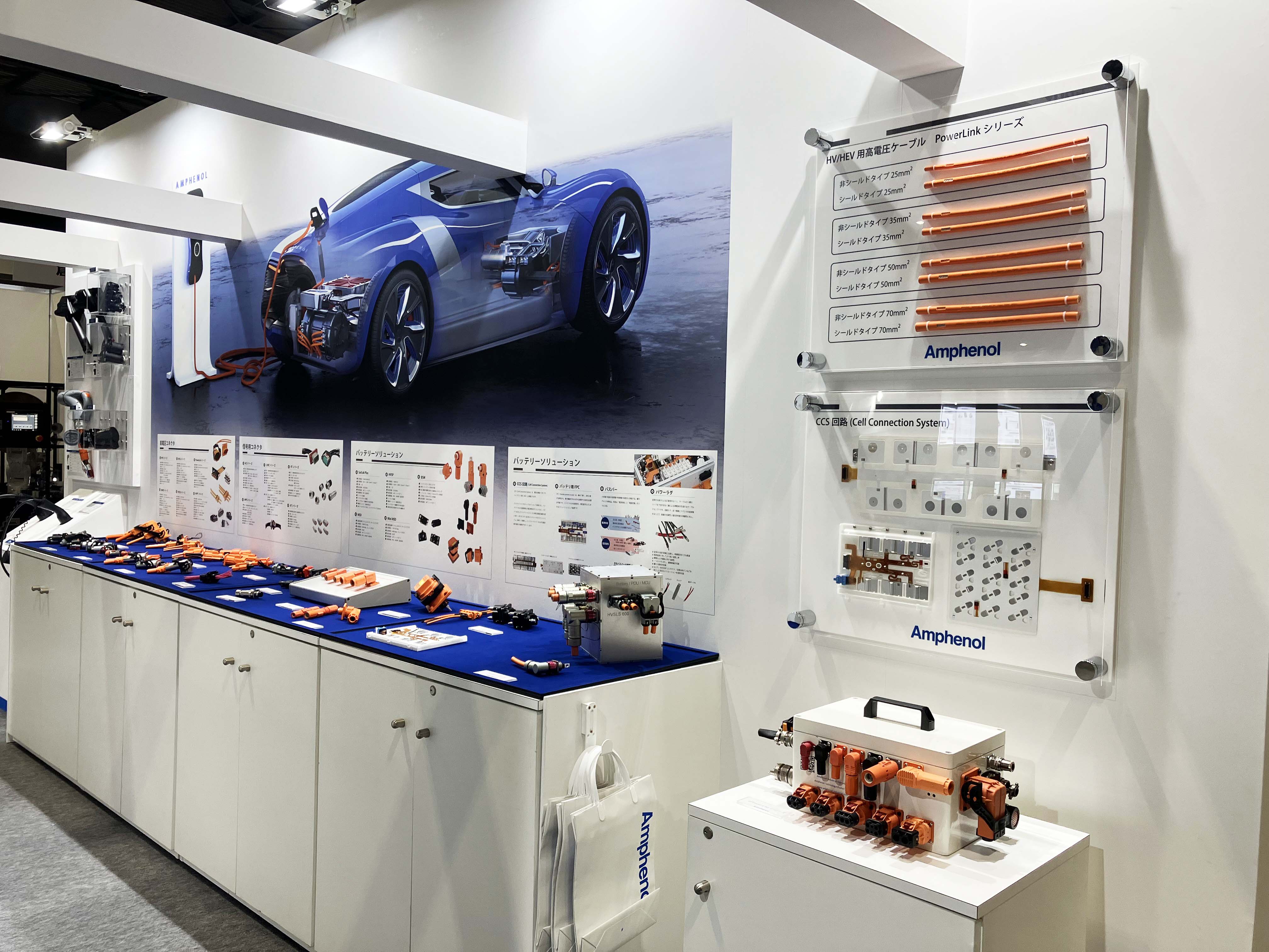 弊社ブースでは、自動車の電動パワートレインやバッテリーシステムで求められる、耐環境性を備えた大電流・高電圧コネクタ、車載向け高速伝送コネクタ、FAKRAコネクタなど、最適なEV・HEV向けインターコネクトソリューションを紹介いたしました。