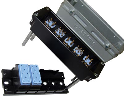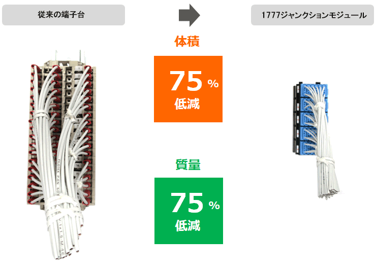 1777ジャンクションモジュールは、一般的な端子台と比較した場合、大きさと重さで約75%の低減効果があります。加えて、1777ジャンクションモジュールは、それ自体のシール性が非常に高いため、防滴、防塵のために筐体で囲う必要はありません。 省スペース、軽量化が求められる鉄道車両には最適な製品です。