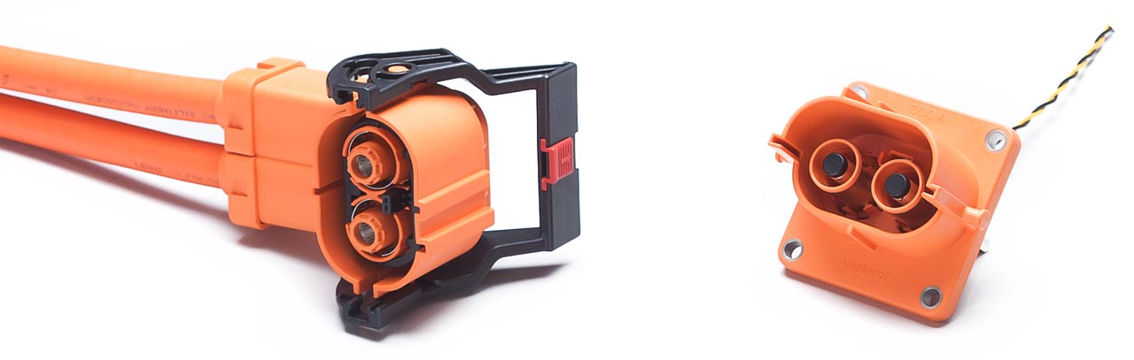 HVC2P60(90°)は、PDU、インバータ、バッテリーシステムなどの電動パワートレイン向けに開発された、2芯、ライトアングル形状の樹脂製高電圧EVコネクタです。定格電圧800V DC、定格電流は最大125A、適用電線サイズ16mm²、25mm²に対応しています。