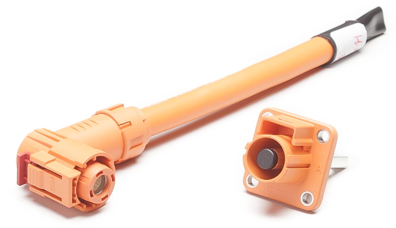 HVSC1P80(90°) は、バッテリーシステムなどの電動パワートレイン向けに開発された、1芯、ライトアングル形状の樹脂製高電圧EVコネクタです。定格電圧1000V DC、定格電流は最大220A、適用電線サイズ16mm²~50mm²に対応しています。