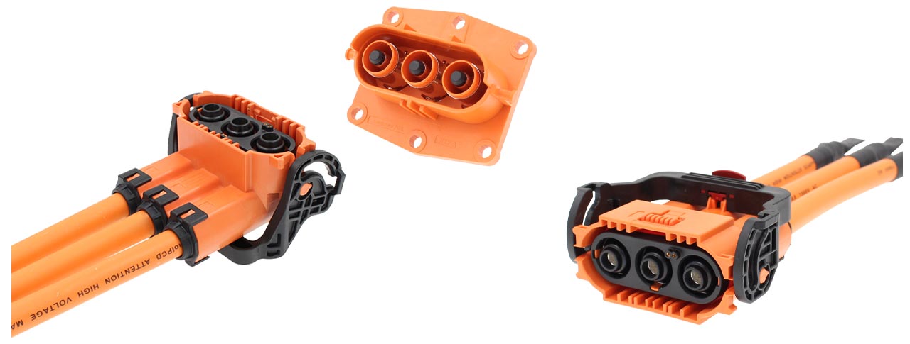 モータ、MCU、インバータ、バッテリーシステムなどの電動パワートレイン向けに開発された、3芯の樹脂製高電圧EVコネクタです。形状はストレートタイプと90°アングルタイプを取り揃え、定格電圧1000V DC、定格電流は最大180A、適用電線サイズ25mm²~50mm²に対応しています。