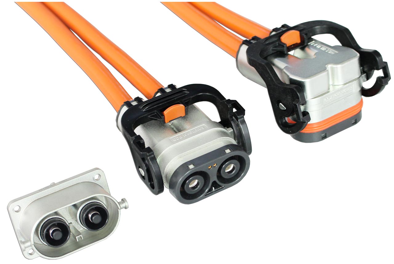 PDU、インバータ、バッテリーシステムなどの電動パワートレイン向けに開発された、2芯のメタル製高電圧EVコネクタです。形状はストレートタイプと90°アングルタイプを取り揃え、定格電圧1000V DC、定格電流は最大120A、適用電線サイズ16mm²、25mm²に対応しています。