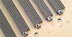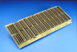 マザーボード側NAFIコネクタに取り付けられるフォークコンタクトは、プレスフィットタイプが標準仕様となります。基板スルーホールにプレス機を用いて一括圧入できるため、半田実装に比べ飛躍的に実装工数を低減できます。特に多極のコネクタを用いて、多くのモジュール基板を接続するような大型マザーボードアセンブリに、NAFIコネクタは最適です。
