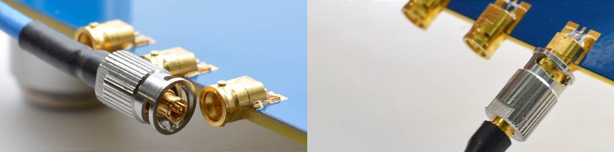 QB (QuarterBack®) シリーズは、65GHzまでの高周波をカバーする、ワンタッチバヨネット嵌合の小型同軸コネクタです。コネクタの離脱は1/4回転のバヨネット式のために、引抜力が大幅に低減されます。プッシュオン式のSMP/SMPMコネクタのように離脱に専用ツールを必要としませんので、基板の半田接続部にダメージを与えることなく、簡単に何度も抜き差しできます。