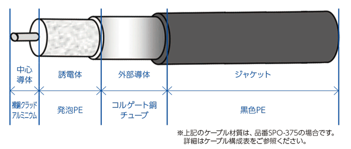 SPO カタログ SPO シリーズは、柔軟性、低PIM特性を備えた屋外用途の同軸ケーブルです。 ポリオレフィンジャケットを採用し、屋外用途のアプリケーションにご利用いただけます。 特長 無線システムに最適な低PIM特性 優れた柔軟性 コルゲートシールドを採用し、シールド効果100dBを実現 10年間保証 ケーブル構造図 SPO カタログ お問合せ