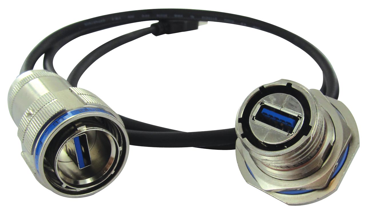 USB3FTVは、メタル製プラグに標準のUSB 3.0コードセットを通すことで、衝撃、塵埃、液体の侵入を完全シャットアウトすることができる耐環境型USB 接続コネクタです。本コネクタをお使いいただくことで、現場でのケーブル結線やグランディング作業の危険から解放されます。またプラグにコードセットを組み込んだ状態でご提供もできます。プラグカップリングは、MIL-DTL-38999 シリーズIIIと同じくアンチデカップリング構造になっており、高振動環境での使用に適しています。