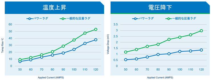 温度上昇と電圧降下(パワーラグ vs. 一般的な圧着ラグ)