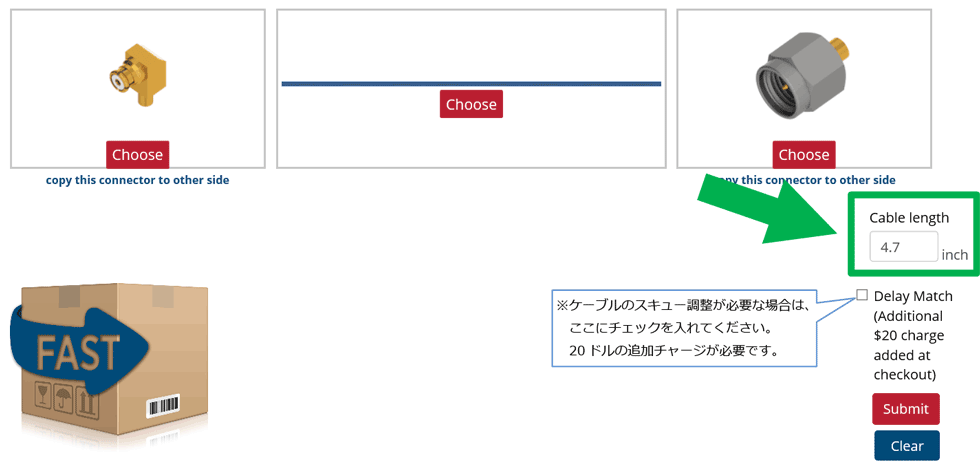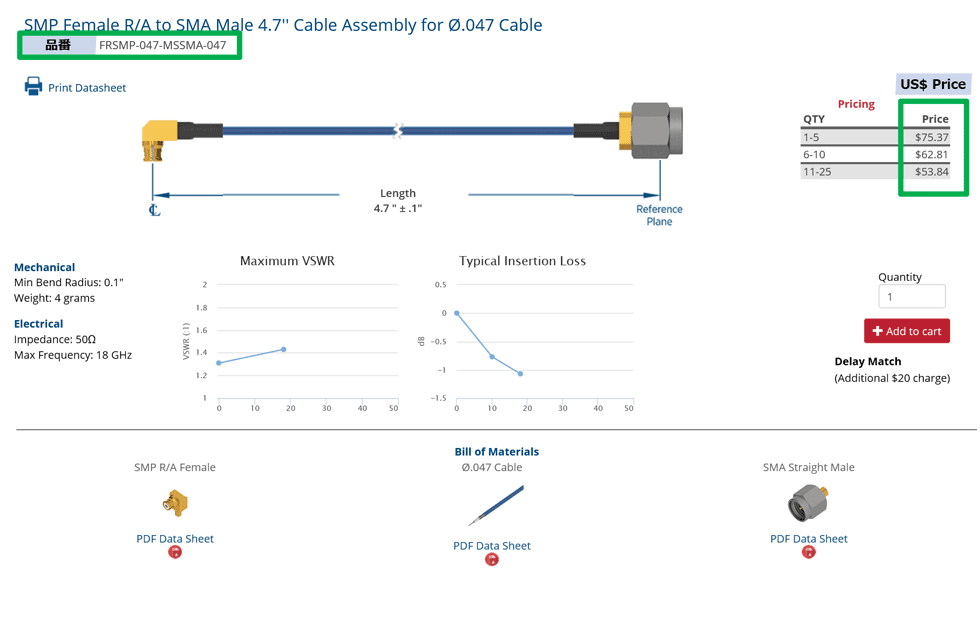 品番、必要数量、US$ Price を弊社の営業担当に、もしくはお問合せから弊社までお知らせください。円価に 換算してお見積り回答します。なお、1オーダーにつき、30,000円ミニマムとなっています。ケーブル長が6インチ、 12インチ、24インチの場合、多くの組合せは 標準品番で1本からお届けすることができます。