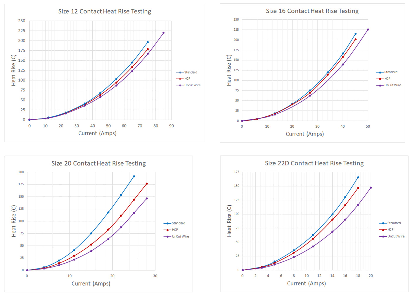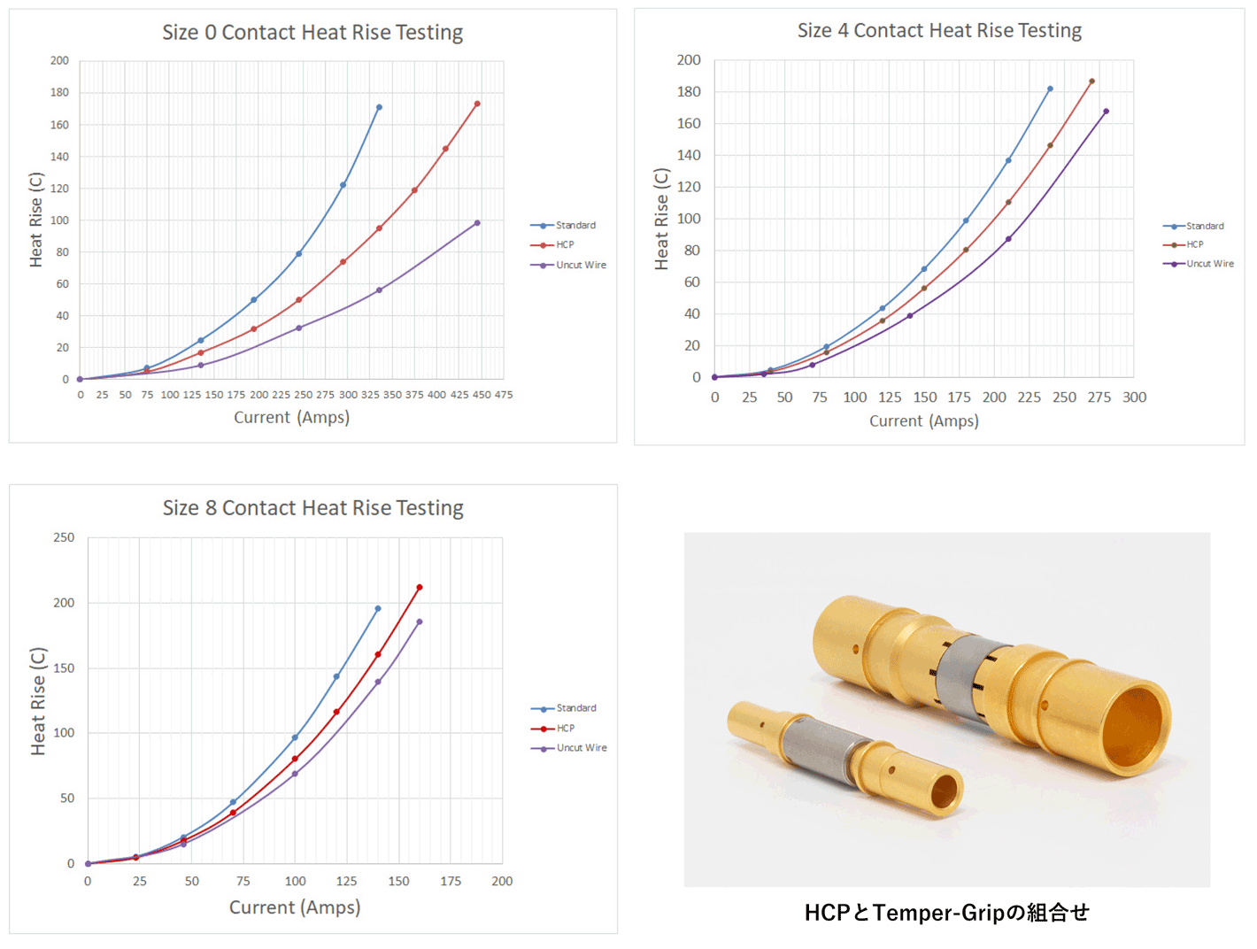 コンタクトサイズ22D~0をラインアップしており、高温に強い高電流のソケットコンタクトTemper-Grip注)と組合せることで、電流容量を最大化できます。HCPはシリーズFIVE、Matrix38999など、多様なMIL丸型コネクタに組込み可能です。