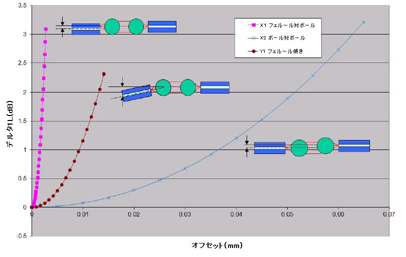 ビームのアライメントは、光学挿入損失性能にとって非常に重要です。グラフ1の挿入損失の増大率が示すとおり、ボール対ボールのビームオフセットは、角度ビームアライメント(フェルール傾き)やレンズ対光ファイバ(フェルール対ボール)のアライメントに比べて、挿入損失が少ないです。
