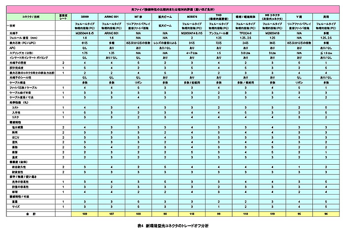 たとえば、ある航空宇宙プラットホームが、複数のシングルモード光ファイバ接続が必要であると想定します。要求事項としては、非常に厳しい衝撃や振動下においても、優れた光学性能、低い後方反射と適度な重量です。いろいろなタイプの既存コネクタを、以下の要求事項に限定して、表4で比較します。