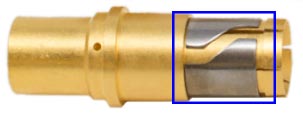 Temper-Gripは、ナプキンリングでソケットのばねの緩みを抑制し、高温下でも大電流を使用できるコンタクト技術です。ソケットコンタクトは、長時間にわたって高い温度にさらされると応力緩和現象が進行し、ばね保持力が低下します。Temper-Gripは、ベリリウム銅製ばね接触部の接圧を、高強度のステンレス製リングで維持することにより、接触抵抗を低く保つことができます。そのため、200℃以上の高温下でも最大220Aの大電流を流すことが可能になりました。